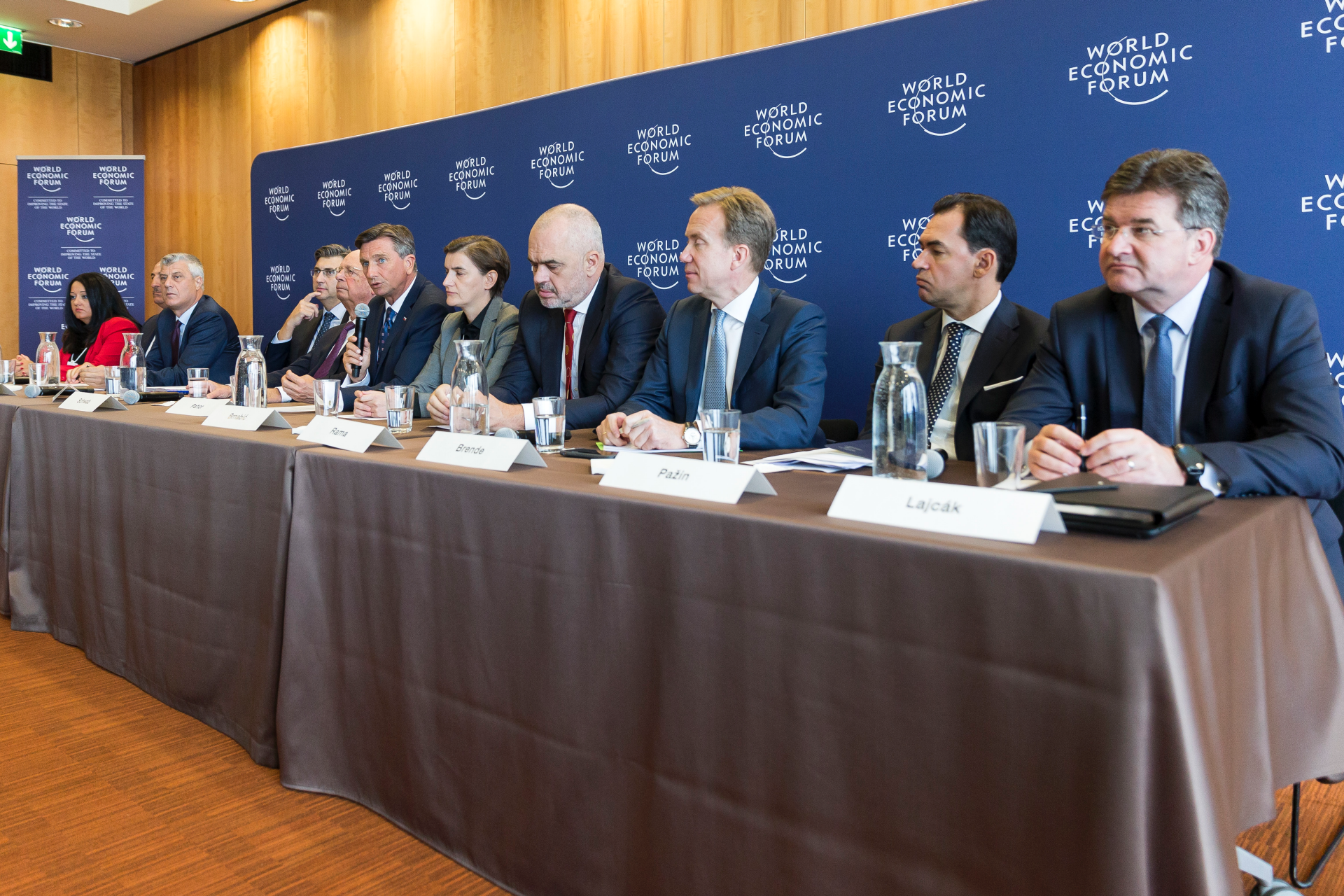 The head of the World Economic Forum says its move to bring together leaders from four western Balkan countries and regional powers aims to fight "complacency" in a region facing lingering tensions on a route used by migrants into Europe.